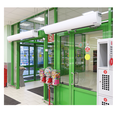 Воздушная завеса Оптима для защиты дверей и ворот высотой от 3 до 5м. Благодяря верхнему всасыванию воздуха, передняя панель завес остается всегда чистой.